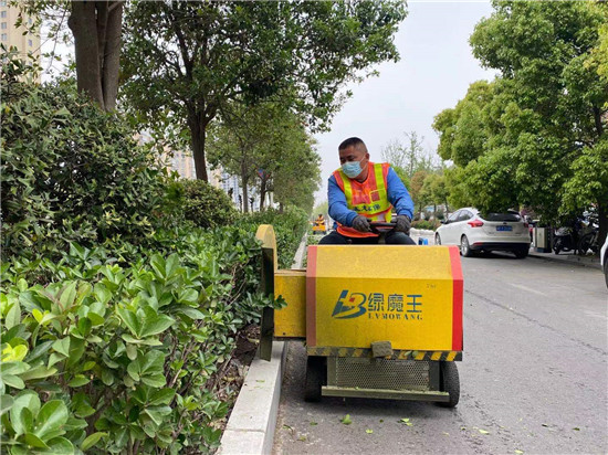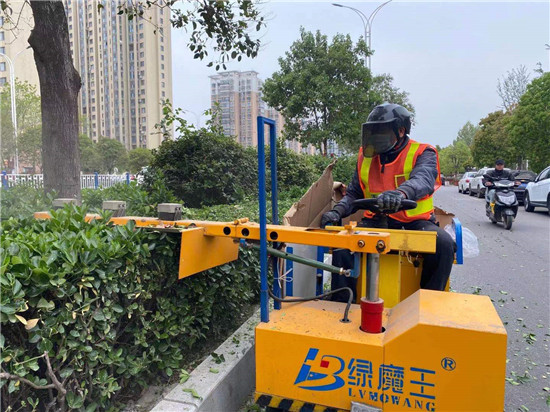 4月13日,周口大道上園林工人操作著特殊的園林作業車,修剪路邊的綠化樹,使用“電推子”,不僅提高了效率、節省了人力,就連“剃”出來的“平頭”也更平了?!半娡谱印彼街?,綠化樹被修剪得很齊整。②9