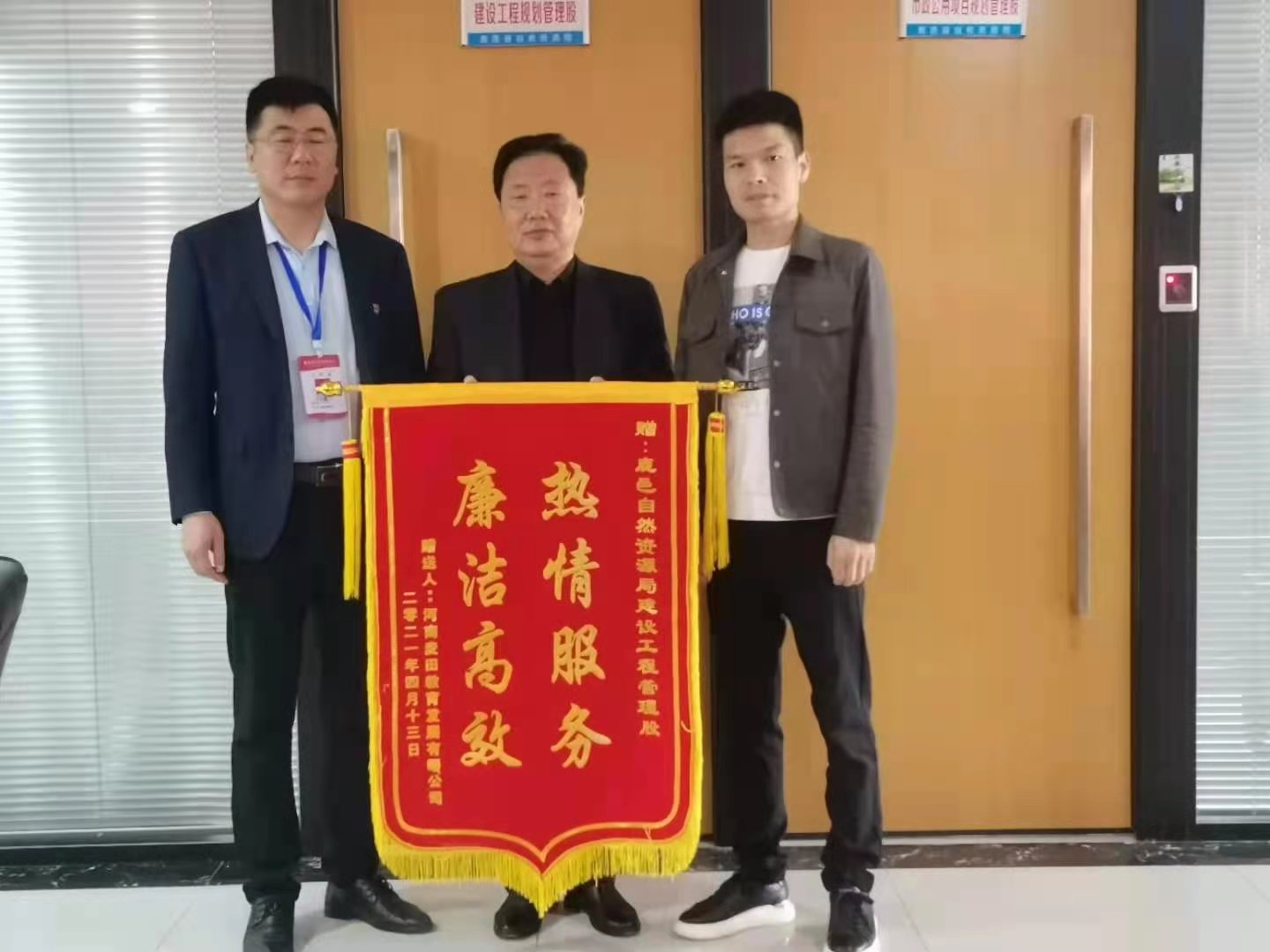 4月14日上午,河南麥田教育發展有限公司將一面印有“熱情服務、廉潔高效”字樣的錦旗送到了鹿邑縣自然資源局建設工程規劃管理股,感謝他們提供了優質高效服務。