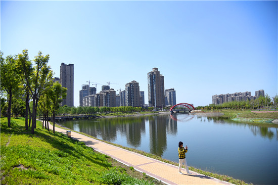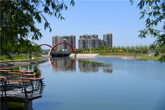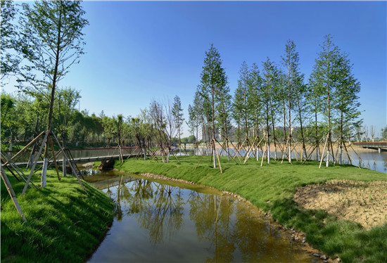 眼下雖不是詞中所描繪的初春時節,但是暮春的水系風光更具詩情畫意。女媧路魚翔湖是一處以水凈化、水景觀、水科普為主的濱河濕地游園。漫步于此,新綠點綴其中,步道曲徑通幽,河水清澈透明,頓覺神清氣爽。沙河玉盤落珠節點,曲廊環繞,波光鱗鱗,垂柳慢舞,河流猶如飄帶蜿蜒流淌,一路步行聞花香聽鳥鳴,繪出一幅唯美畫卷。②9