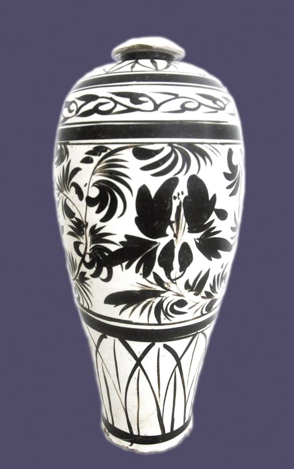 磁州窯,在今河北省磁縣,因其古屬磁州而得名,影響范圍較廣,北方各地紛紛效仿,形成了龐大繁雜的磁州窯體系,主要分布于河南、河北和山西等地,由宋、遼、金延續(xù)至元、明、清。磁州窯系以白地黑彩瓷器著稱于世,做工精致巧妙,器型端莊工整,黑白對(duì)比強(qiáng)烈,圖案鮮明醒目,簡(jiǎn)練生動(dòng),形成了磁州窯系特有的紋飾風(fēng)格。磁州窯系的梅瓶,整體紋飾繁而不亂、典雅秀美,更是磁州窯系瓷器中之上品佳作,也是我國(guó)古代陶瓷藝術(shù)的名貴品種。