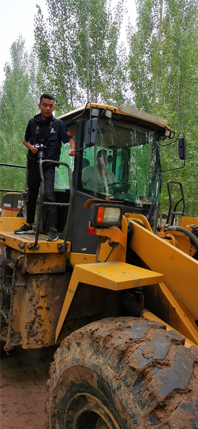 記者李龍周來到扶溝縣曹里鄉賈魯河擺渡口大閘附近,為找到更為合適的拍攝角度記者爬上了救災鏟車。
