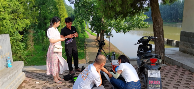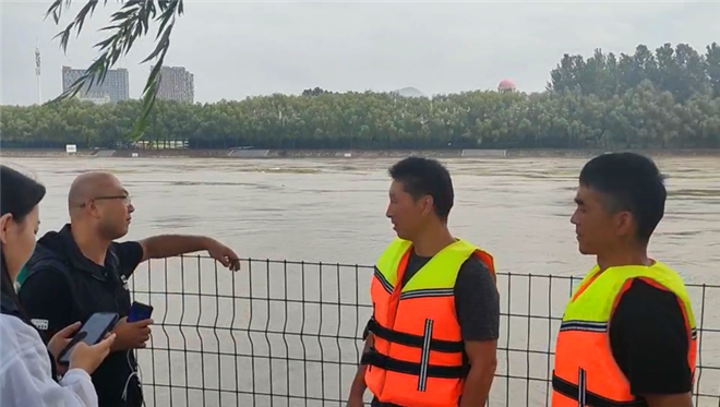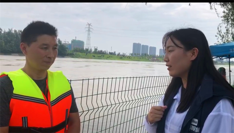 記者王丹、房杰等來到賈魯河橋小閘附近進行直播