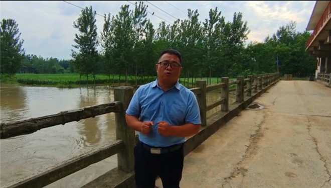 記者軒洋在扶溝縣北關大閘介紹水位情況