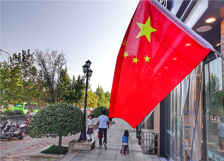 9月30日,市區臨街商鋪門前五星紅旗隨處可見,紅旗隨風飄揚,將街道裝扮一新,喜迎國慶節的到來