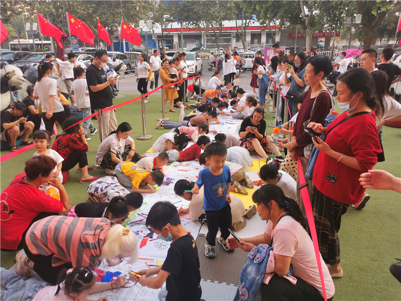 10月1日下午,在位于周口市中心城區七一路與中州大道交叉口的萬果園家庭茂商超前,近百名小朋友聚集在一起用手中的畫筆表達對祖國母親的祝福。