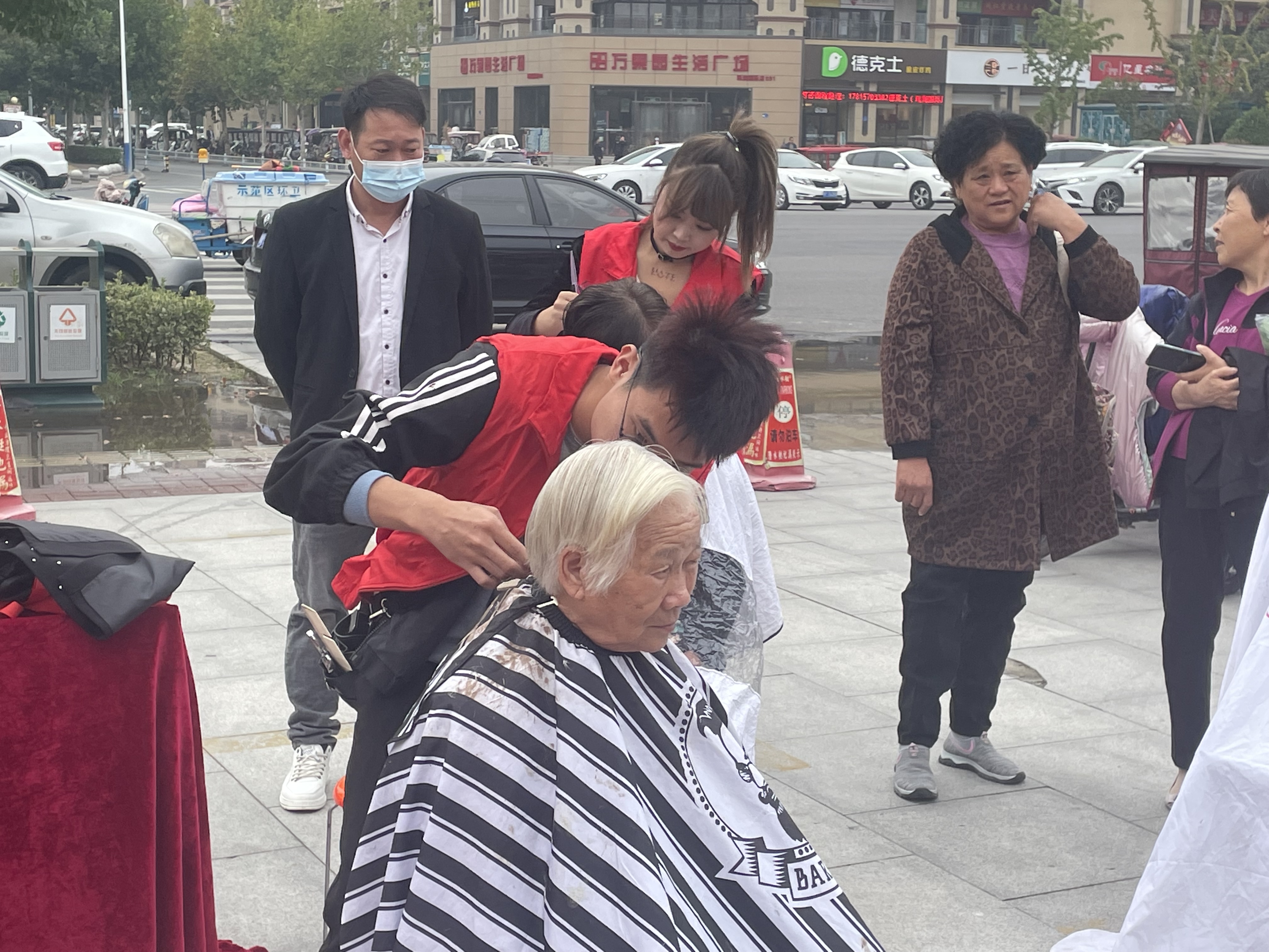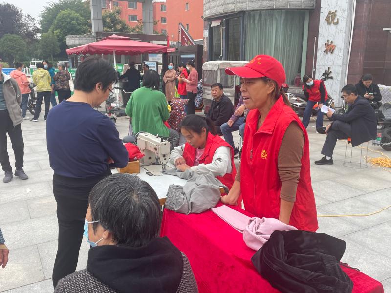10月14日,在川匯區文昌大道的中原社區A區大門口,數十名身穿紅馬甲的志愿者在忙著幫社區老年人截褲腳、剪頭發、補鞋子。志愿者們深入社區,為老年人服務。此外,他們還在蓮花路、太昊路、文明路、交通路街頭值勤,助力文明周口建設。①5
