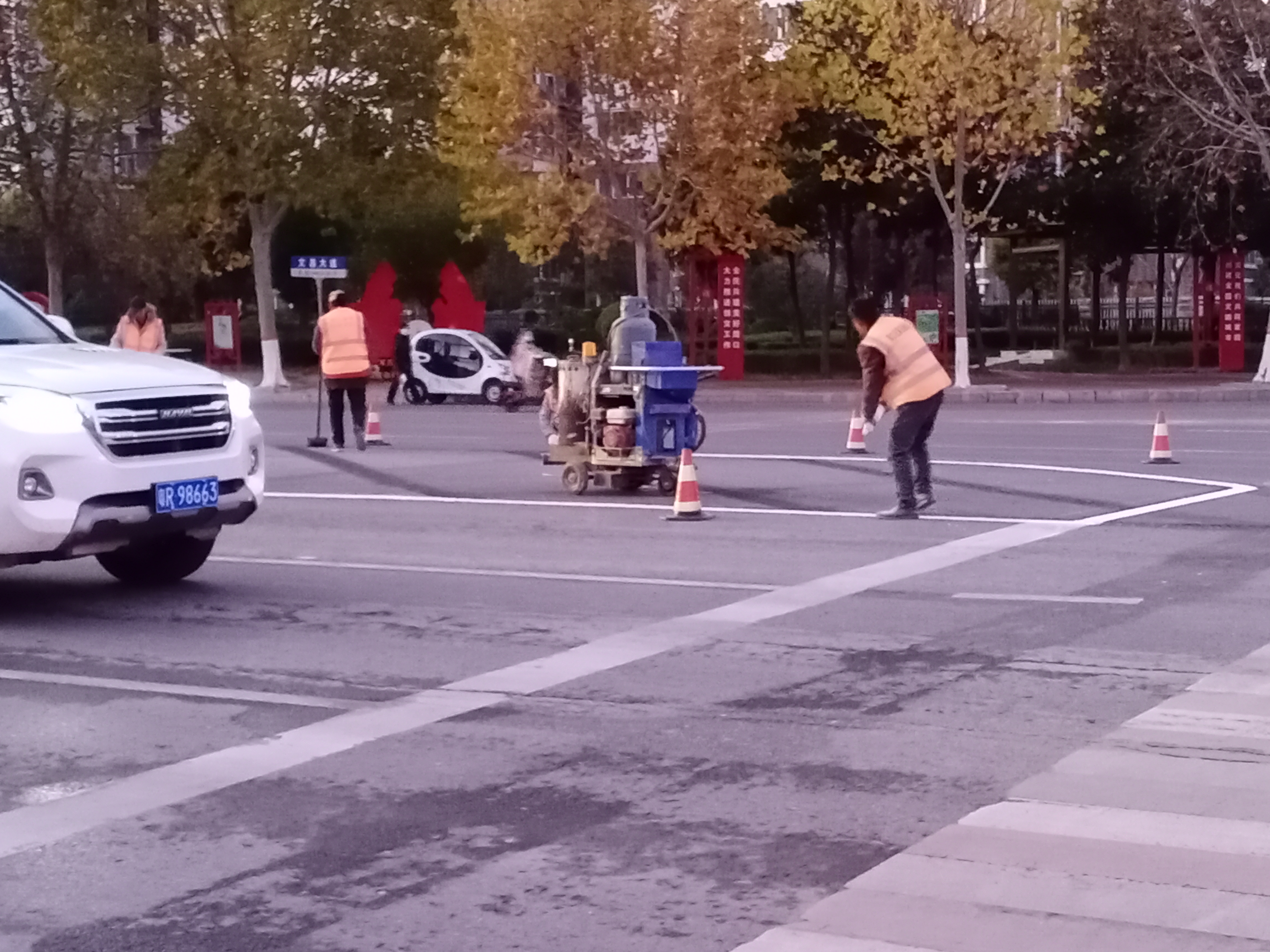 11月9日17時許,記者在周口市中心城區文昌大道與中原路交叉口看到,施工人員正在對交叉路口上的交通標志線進行施劃,規范車輛和行人通行秩序,保證交通安全暢通有序,方便群眾出行。③3記者 張洪濤 攝