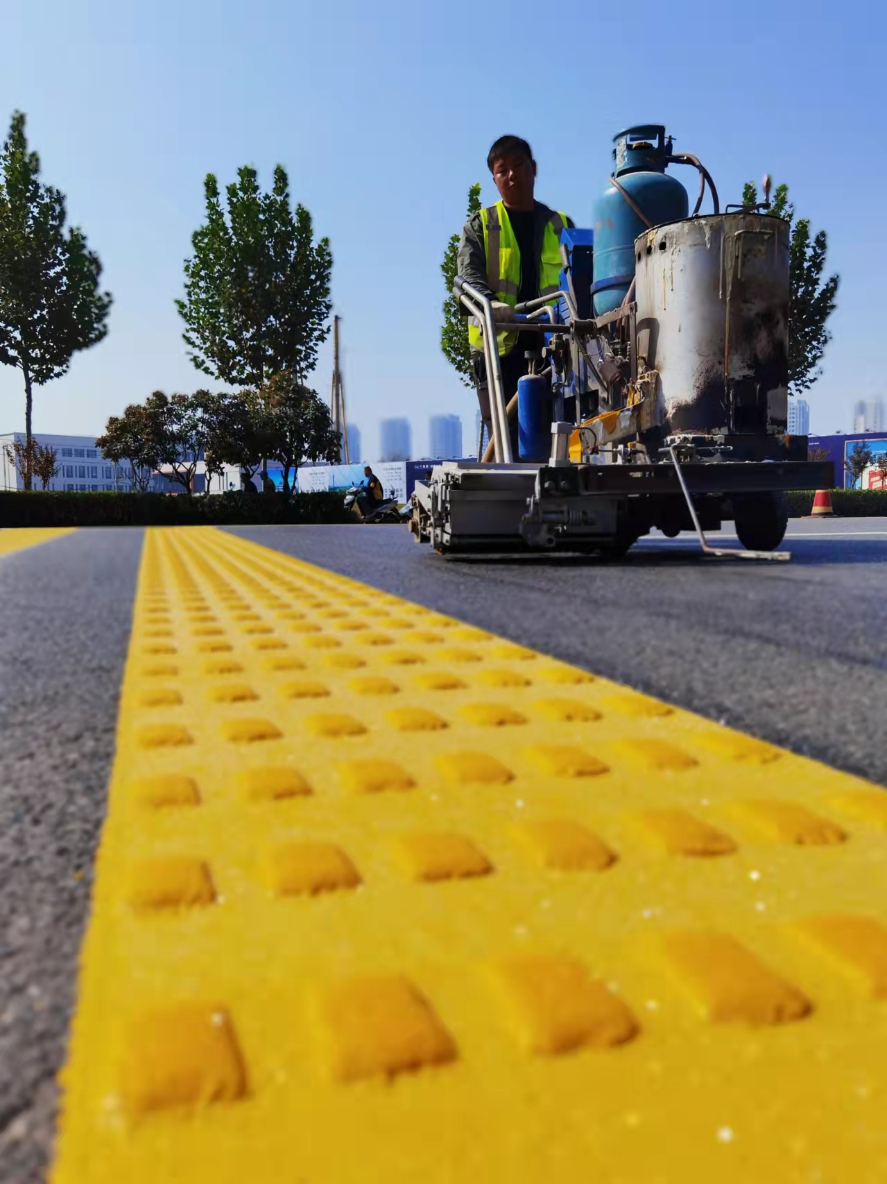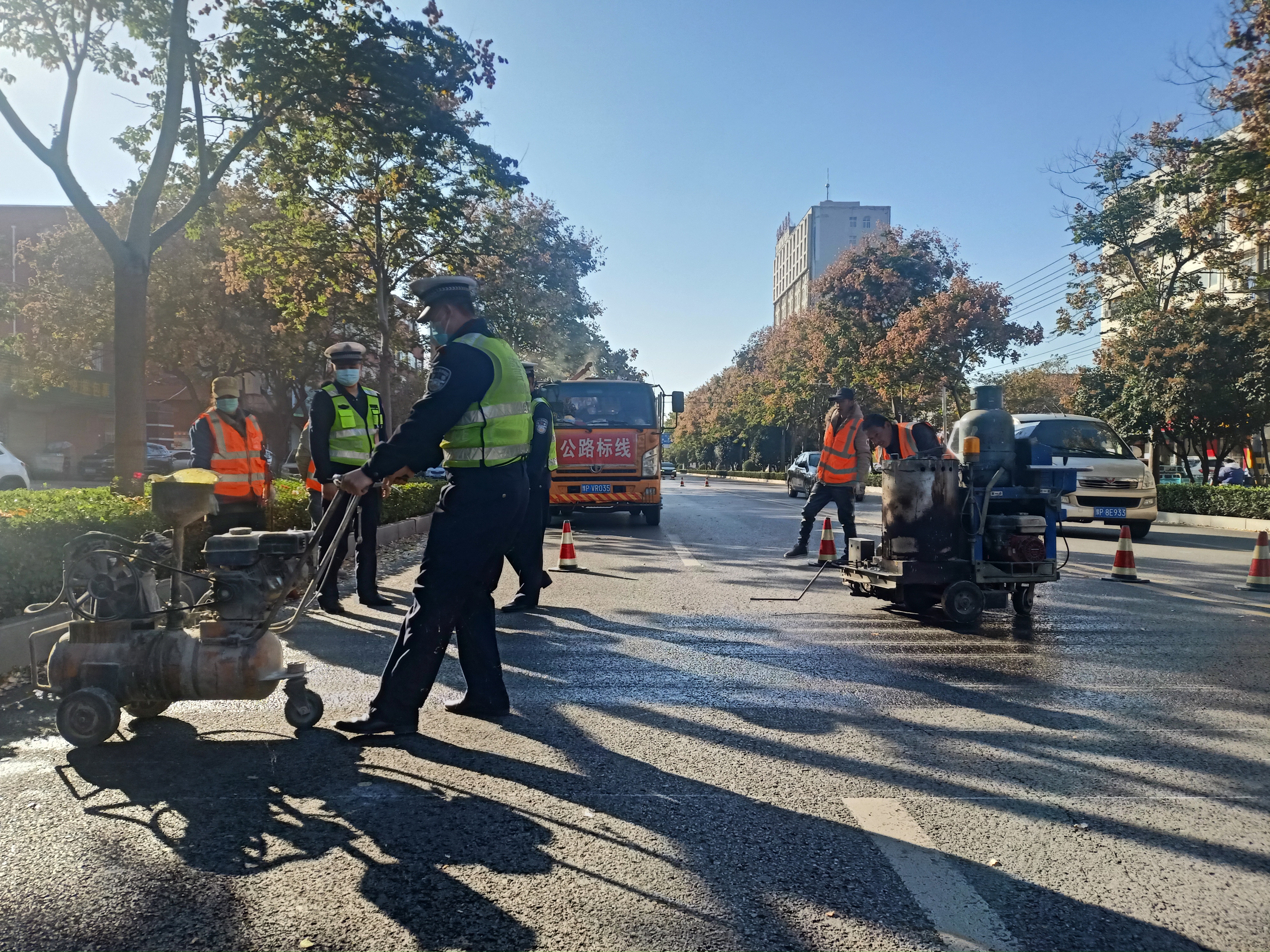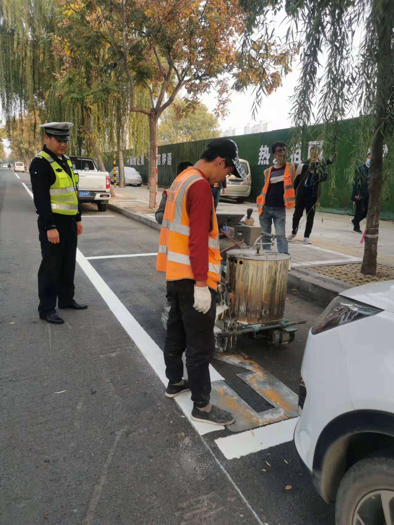 當日下午,記者在黃河路看到,施工人員正在熟練地操作標線機,認真細致地施劃減速震蕩標線。市公安局交通管理支隊設施維護中心(以下簡稱設施維護中心)工作人員黃勇說:“在創文期間,設施維護中心加大對道路護欄的清洗力度,完善交通信號燈的維護,清除學校門口不合理的停車位,修剪遮擋交通設施的樹枝,排除路口的交通隱患。”