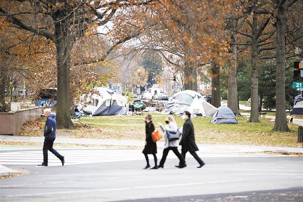 12月8日,在美國華盛頓,行人經過無家可歸者居住的帳篷。
