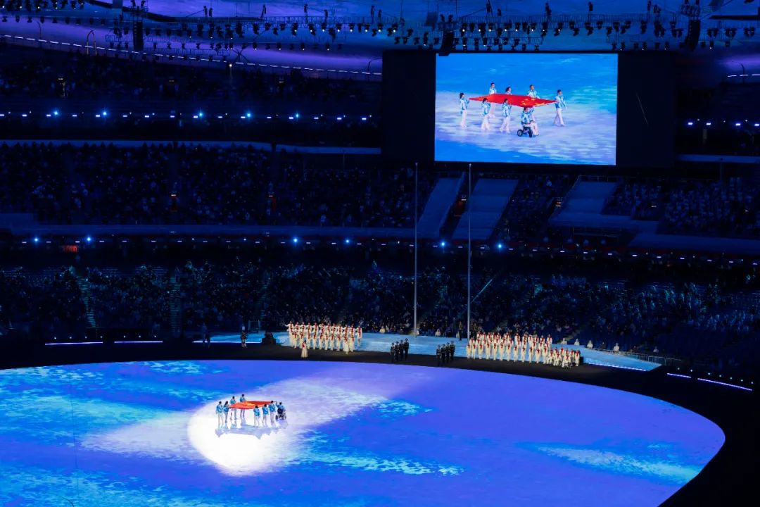 這是中華人民共和國國旗在開幕式上升起。新華社記者 杜瀟逸 攝