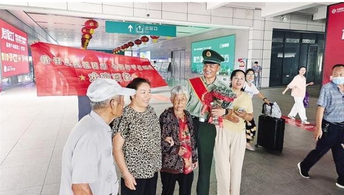 9月4日,在高鐵周口東站出站口,市民們早早守候,手拉橫幅,眼里閃著期待的淚光,迎接從部隊退役的親人。橫幅上的每一個字,都是家人最深沉的愛與最由衷的敬佩:“昔日從戎報國志,今朝卸甲創輝煌。”